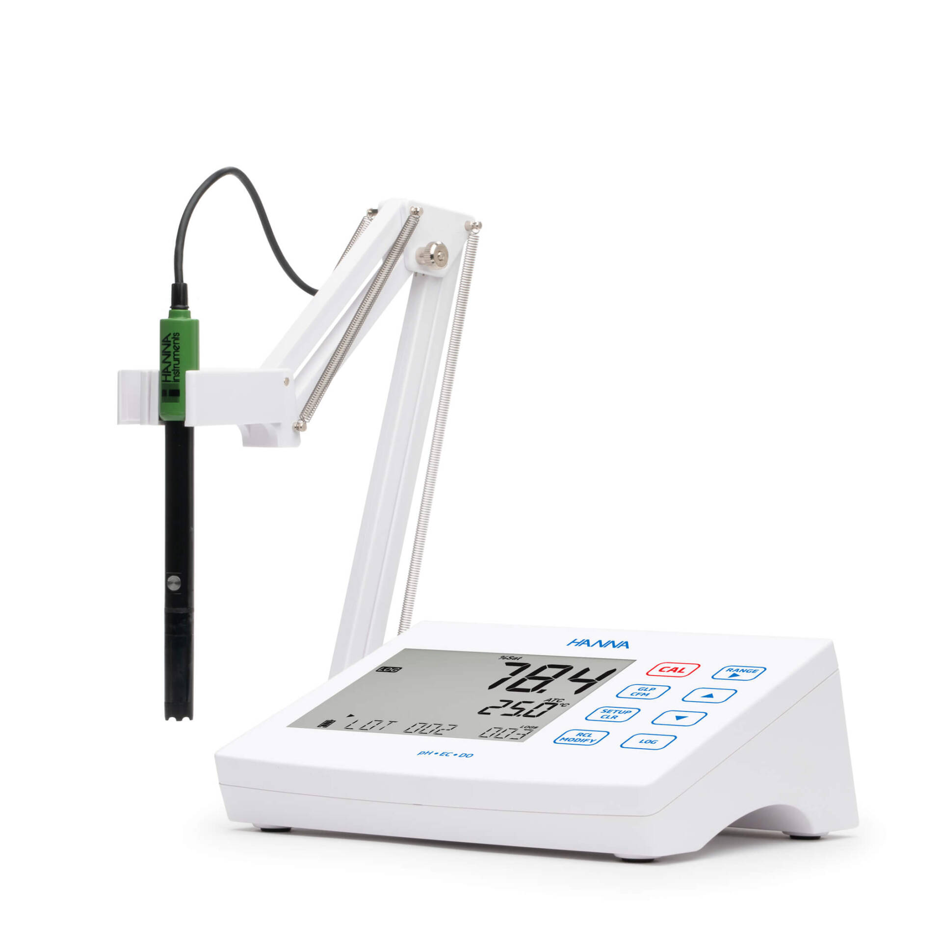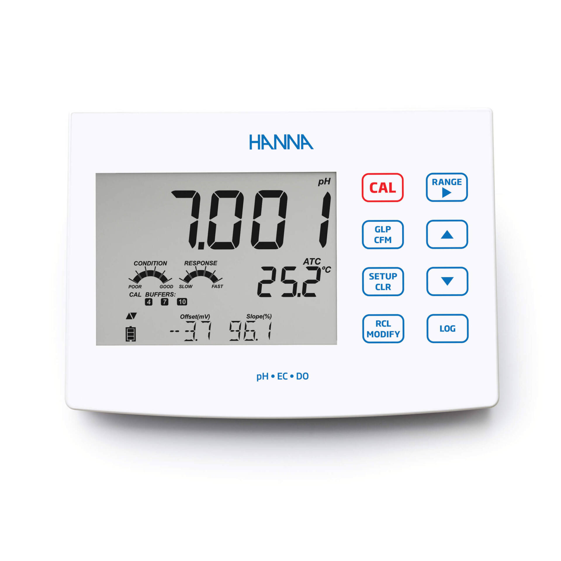 La función exclusiva CAL Check de Hanna analiza la respuesta del electrodo de pH en los tampones de calibración para detectar posibles problemas, como soluciones contaminadas o electrodos sucios. Una vez completada la calibración, en la pantalla de medición se muestran indicadores que reflejan el estado de la sonda, basados en su desviación y características de pendiente— se muestran en la pantalla de medición.
