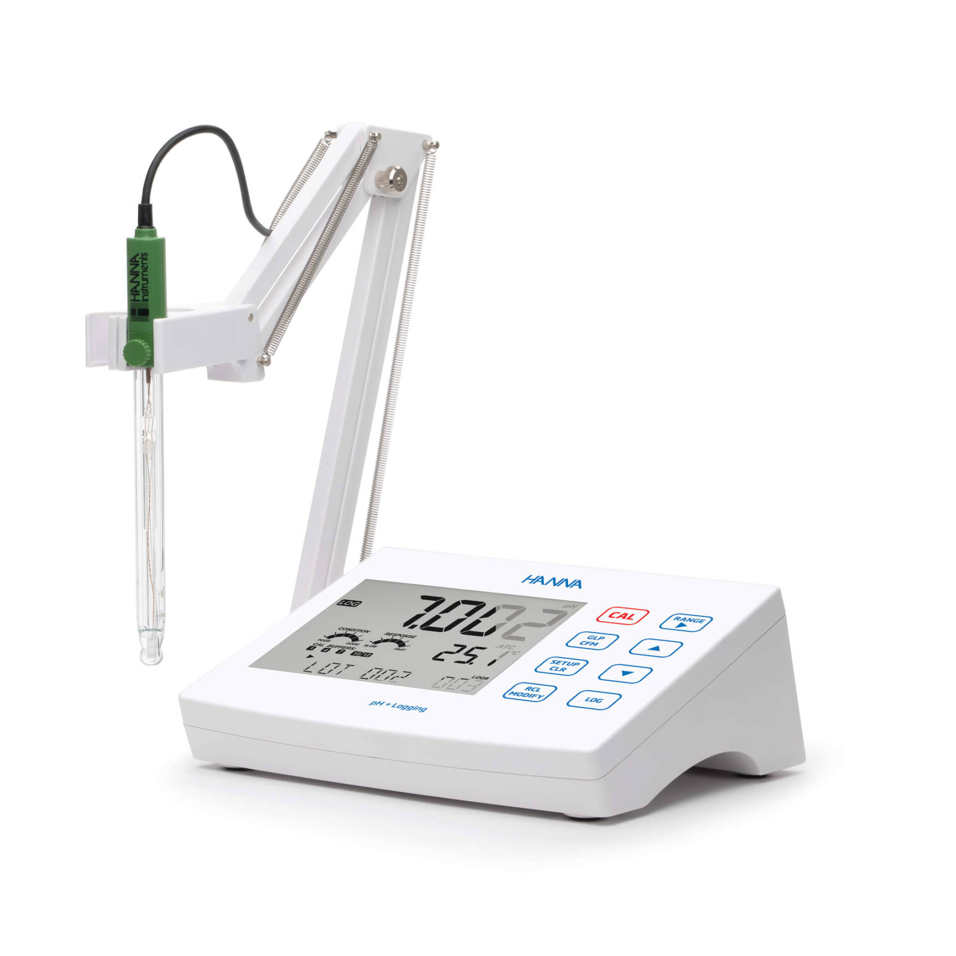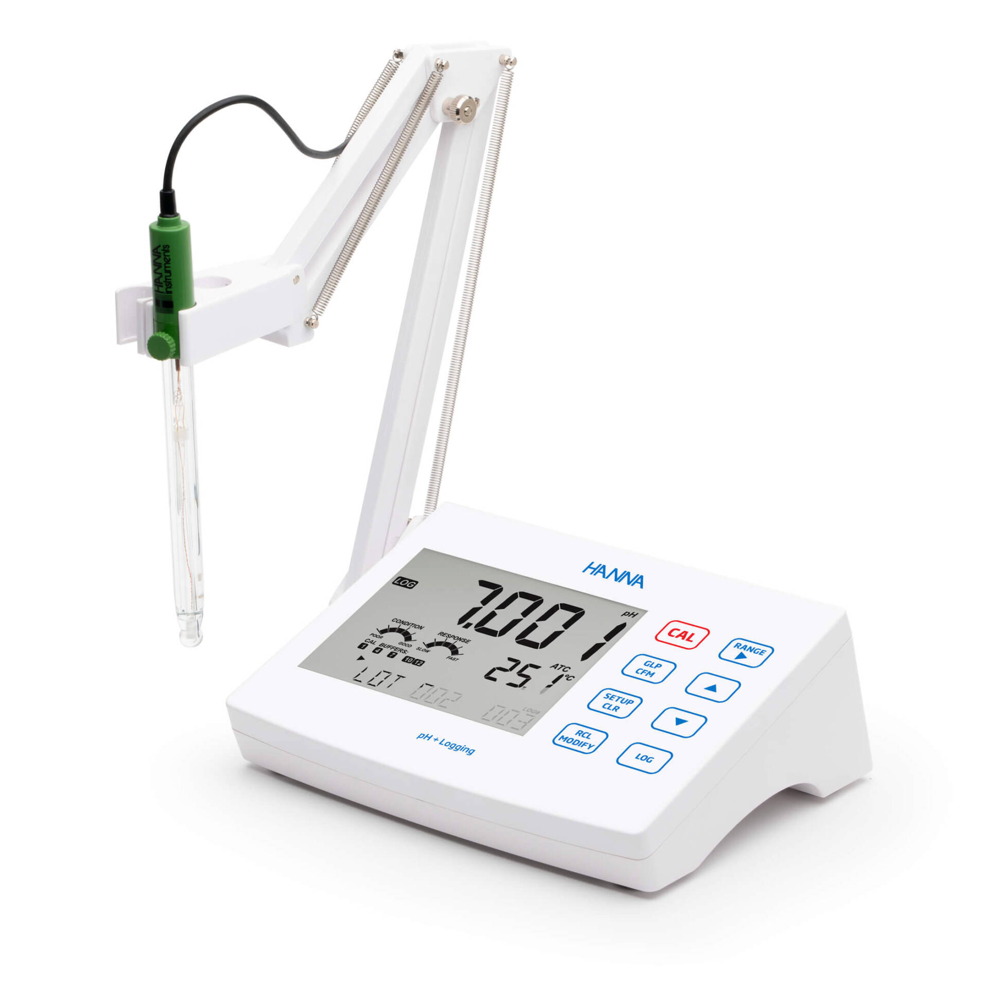 La función CAL Check, exclusiva de Hanna, analiza la respuesta del electrodo de pH en los tampones de calibración para detectar posibles problemas, como soluciones contaminadas o electrodos sucios. Una vez completada la calibración, los indicadores reflejan el estado de la sonda, basándose en su desviación y las características de la pendiente se muestran en la pantalla de medición.